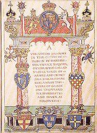 Following the Flight of the Earls[2] in 1607, Chichester was a leading figure during the Plantation of Ulster. Initially he intended that the number of Scottish planters would be small, with native Irish landowners gaining more land. However, after O'Doherty's Rebellion in Donegal in 1608, his plans changed and all the native lords lost their land. Most of the land was awarded to wealthy landowners from England and Scotland. However Chichester successfully campaigned to award veterans of the Nine Years' War land as well, funded by the City of London Livery Companies.