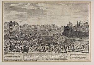 Balmerino went to his execution unrepentant, stating "If I had a thousand lives, I would lay them all down in the same cause".[7] His insouciant attitude at the time of his trial and execution, joking with bystanders and insisting on taking the axe in his carriage so that Kilmarnock would not be bothered by it, was widely reported in the media of the time.[8] Horace Walpole, in a letter, described him as "the most natural brave old fellow I ever saw [...] at the bar he behaved like a soldier and a man: in the intervals of form, with carelessness and humour".[7] Balmerino's execution is sometimes reported to have taken three blows, though "the first certainly took away all sensation".[9][7] Like Kilmarnock he was buried in the Church of St Peter ad Vincula: reportedly, at his request, alongside William Murray, Marquess of Tullibardine.