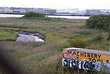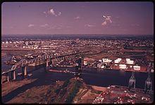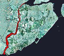 The name Arthur Kill is an anglicization of the Dutch language achter kill meaning back channel, which would refer to its location "behind" Staten Island and has its roots in the early 17th century during the Dutch colonial era when the region was part of New Netherland.[2] Placenaming by early explorers and settlers during the era often referred to a location in reference to other places, its shape, its topography, and other geographic qualities.[3] Kill comes from the Middle Dutch word kille, meaning riverbed, water channel, or stream. The area around the Newark Bay was called Achter Kol.[4] During the British colonial era the bay was known as Cull bay.[5] The bay lies behind Bergen Hill, the emerging ridge of the Hudson Palisades which begins on Bergen Neck, the peninsula between it and the Upper New York Bay. The sister channel of Arthur Kill, Kill van Kull refers to the waterway that flows from the col or ridge or passage to the interior and translates as channel from the pass or ridge.