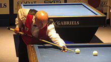 World title competition first started in 1986 and required the use of ivory balls. However, this requirement was dropped in 1990. The highest score ever achieved in world competition was 374, by the Frenchman Jean Reverchon in 1992, while the highest score in competition overall is 427 set by the Belgian Walter Bax in 2006.[1] The game is played predominantly in Western Europe, especially in France, Belgium and the Netherlands. The game employs a specialized vocabulary, chiefly derived from French words, encompassing many terms that have no analogues in other cue sports disciplines. Some examples are coup fouetté ("whip shot"; a type of force follow); massé coulé (a massé shot with follow) and piqué (describes either a massé shot with no english, or a shot in which the cue stick is steeply angled, but not held quite as vertical as it is in full massé).