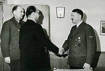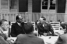 Azad Hind was recognised as a legitimate state by only a small number of countries limited solely to Axis powers and their allies.[18] Azad Hind had diplomatic relations with nine countries: Nazi Germany, the Empire of Japan, Italian Social Republic, Independent State of Croatia and Wang Jingwei Government, Thailand, the State of Burma, Manchukuo and the Second Philippine Republic.[19] On the declaration of its formation in occupied Singapore the Taoiseach of Ireland, Éamon de Valera, sent a note of congratulations to Bose. Vichy France, however, although being an Axis collaborator, never gave formal political recognition to Azad Hind. This government participated as an observer in the Greater East Asia Conference in November 1943.