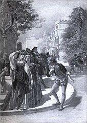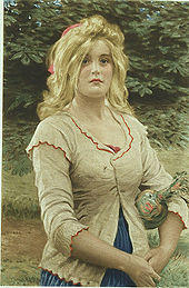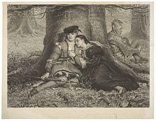 Shakespeare uses prose for about 55% of the text, with the remainder in verse.[10] Shaw explains that as used here the prose, "brief [and] sure," drives the meaning and is part of the play's appeal, whereas some of its verse he regards only as ornament.[11] The dramatic convention of the time required the courtly characters to use verse, and the country characters prose, but in As You Like It this convention is deliberately overturned.[10] For example, Rosalind, although the daughter of a Duke and thinking and behaving in high poetic style, actually speaks in prose as this is the "natural and suitable" way of expressing the directness of her character, and the love scenes between Rosalind and Orlando are in prose (III, ii, 277).[12] In a deliberate contrast, Silvius describes his love for Phoebe in verse (II, iv, 20). As a mood of a character changes, he or she may change from one form of expression to the other in mid-scene. Indeed, in a metafictional touch, Jaques cuts off a prose dialogue with Rosalind because Orlando enters, using verse: "Nay then, God be with you, an you talk in blank verse" (IV, i, 29).[13] The defiance of convention is continued when the epilogue is given in prose.