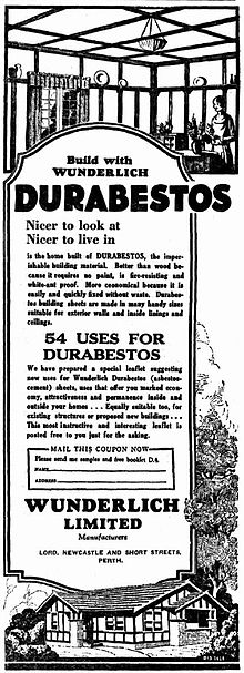 In Australia, asbestos was widely used in construction and other industries between 1945 and 1980. From the 1970s there was increasing concern about the dangers of asbestos, and its use was phased out. Mining ceased in 1983. The use of asbestos was phased out in 1989 and banned entirely in December 2003. The dangers of asbestos are now well known in Australia and there is help and support for sufferers from asbestosis or mesothelioma.[30]