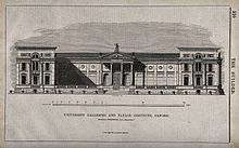 The present building dates from 1841 to 1845. It was designed as the University Galleries by Charles Cockerell[8] in a classical style and stands on Beaumont Street. One wing of the building is occupied by the Taylor Institution, the modern languages faculty of the university, standing on the corner of Beaumont Street and St Giles' Street. This wing of the building was also designed by Charles Cockerell, using the Ionic order of Greek architecture.[9]