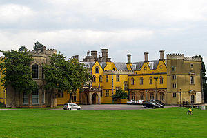 In the early 19th century, the house was given a 300 feet (91 m) long facade in an attempt to provide some uniformity and some classical grandeur.[26] However even here, the architecture does not remain faithful to a single style. At the centre of this facade is a much altered Tudor gatehouse, probably built in the 16th century as a portal to the 14th-century manor house.[27] In order to create the long facade, the existing stables, to the right of the gatehouse, were converted to domestic use and given seven bays of Gothic mullioned windows.[27] To the left of the gatehouse, the flanking south-west wing is of a different style.[27]
