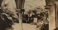 This leads through two arched entrances to one of the most charming winter gardens of which any private mansion in the western counties can boast. It has been formed out of what was formerly the open clock tower court which has been supplied with a glazed iron roof. Round the tessellated flooring have been formed the gracefully curved flower borders edged with glazed tiling surmounted with rockery. This rock work covered with moss and filled in with water plants luxuriant grasses and ferns margins an ornamental sheet of water of serpentine form from the surface of which jets of water are thrown into a huge basin shell – one of the largest of the kind we have seen. It is ingeniously constructed to form a waterfall the streams descending to a second basin shell just above the sheet of water. Around this are some the choicest ferns and palms. From the roof hang clusters of incandescent laps, interspersed with baskets filled with gracefully drooping ferns and from the surface of the water lilies modestly rise.[17]