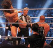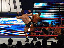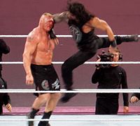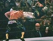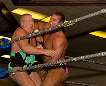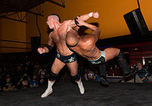 This move, innovated by, popularized and subsequently named after Lou Thesz, sees the attacking wrestler jumping towards a standing opponent, knocking them over their back, sitting on their waist and pinning them in a body scissors.[1] A variation, popularized by Stone Cold Steve Austin, is done in reverse; the attacking wrestler performs the Thesz press on a charging wrestler from a standing position, then instead of pinning them, they attack them with mounted punches.