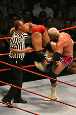 A direct shot to the groin of an opponent;[1] otherwise known as a groin attack, utilized by heel wrestlers such as Ric Flair and Jerry Lawler. It is an offense punishable by disqualification. This illegal attack is mainly used by heel superstars or valets to gain the upper hand on their male opponents. Although kicking an opponent in the groin is the most obvious method, the most popular version sees an attacking wrestler drop to their knees and raise their arm up between the opponent's legs, striking the groin with the inside of their elbow-joint. Shinsuke Nakamura, Seth Rollins and Daniel Bryan are other wrestlers who use the move.