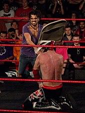 This particular attack was popularized by Edge and Christian and involved two wrestlers sandwiching an opponent's head between two chairs with a simultaneous chair shot from both sides.[13] The "One Man Con-chair-to" involves a wrestler placing their opponent so that they are horizontal with their head resting on a chair, then hitting their head from above with a second chair, squashing the head of the opponent between both.