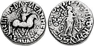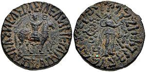 The coinage shows the king on a horse, holding a whip in his right hand, in a style consistent with that of Azes II (who possibly is identical with Azes I). On the reverse, Athena makes a benediction gesture, and is flanked by a Buddhist triratna symbol.