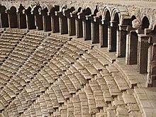 In order to keep with Hellenistic traditions, a small part of the theatre was built so that it leaned against the hill where the Citadel (Acropolis) stood, while the remainder was built on vaulted arches. The high stage, whose supporting columns are still in place,[4] served to seemingly isolate the audience from the rest of the world. The 'scaenae frons' or backdrop, has remained intact. The 8.1 metre (27 ft) sloping reflective wooden ceiling over the stage has been lost over time. Post holes for 58 masts are found in the upper level of the theatre. These masts supported a velarium or awning that could be pulled over the audience to provide shade.[9]
