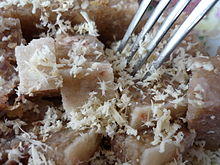 Aspic jelly may be colorless (white aspic) or contain various shades of amber. Aspic can be used to protect food from the air, to give food more flavor, or as a decoration.[9] It can also be used to encase meats, preventing them from becoming spoiled. The gelatin keeps out air and bacteria, keeping the cooked meat or other ingredients fresh for longer.[10]There are three types of aspic: delicate, sliceable, and inedible.[11] The delicate aspic is soft. The sliceable aspic must be made in a terrine or in an aspic mold. It is firmer than the delicate aspic. The inedible aspic is never for consumption and is usually for decoration. Aspic is often used to glaze food pieces in food competitions to make the food glisten and make it more appealing to the eye. Foods dipped in aspic have a lacquered finish for a fancy presentation.[12] Aspic can be cut into various shapes and be used as a garnish for deli meats or pâtés.[13]