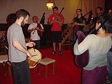 The courses at the Escola de Gaitas (Bagpipe School) are divided into three levels. The Transmontan bagpipe is generally reserved for the advanced levels. Beginners start with the Galician bagpipe. As a non-profit institution, the school lacks its own facilities, and the classes are offered in various spaces, including the Alentejan Center of Lisbon. Students may rent an instrument, or buy one from the group's workshop.