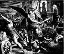 During the siege, Hezekiah dressed in sackcloth (a sign of mourning), but the prophet Isaiah assured him that the city would be delivered and Sennacherib would fail.[1] Overnight, an angel killed 185,000 Assyrian troops.[2] Some scholars believe this number has been transcribed incorrectly, with one study suggesting the number was originally 5,180.[3]