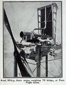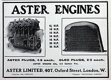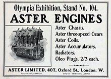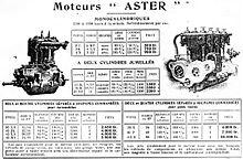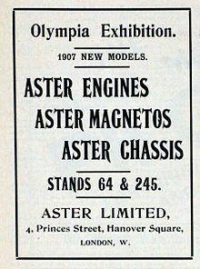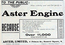 In 1904 the Parisian newspaper Le Petit Journal stated that Aster monopolised the mass manufacture of engines in France, and had a 'universal reputation' and success shown by innumerable users.[13] By 1912 they claimed to cater for over 130 makes.[14]