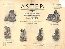 - ^ Aster brochure of Myers, New York, 1900s. Listing Stationary motors; Electricity generator; Air cooled range; Water cooled range; and listing Gasoline motors, Kerosene motors and Gas Motors for Automobiles, launches, Electric generators and stationary work. Distributed in the USA by 'A J Myers', New York.