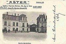 In 1878 the Aster company was established at 102 rue de Paris, Saint-Denis.[15] Engine id plates stated 'Ateliers de Construction Mécanique l'Aster. 74, Rue de la Victoire, Paris (the registered office), Usines à St Denis (Seine) (The factory).