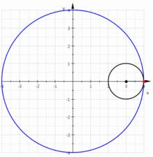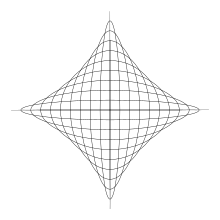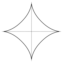An astroid is a particular mathematical curve: a hypocycloid with four cusps. Specifically, it is the locus of a point on a circle as it rolls inside a fixed circle with four times the radius.[1] By double generation, it is also the locus of a point on a circle as it rolls inside a fixed circle with 4/3 times the radius. It can also be defined as the envelope of a line segment of fixed length that moves while keeping an end point on each of the axes. It is therefore the envelope of the moving bar in the Trammel of Archimedes.