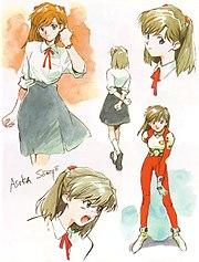 In the early design stages of Neon Genesis Evangelion, director Hideaki Anno proposed to include a girl similar to Asuka as the protagonist of the anime.[2] Character designer Yoshiyuki Sadamoto proved reluctant to the idea of re-proposing a female character in the lead role after the previous works of Gainax, such as Gunbuster and Nadia: The Secret of Blue Water; he himself declared: "A robot should be piloted by a trained person, whether it is a woman or not makes no difference, but I cannot understand why a girl should pilot a robot." Sadamoto asked the director to include a boy in the role of main character, thus downgrading her to the role of female co-protagonist. Sadamoto himself modeled the relationship between Asuka and male protagonist Shinji Ikari basing on Nadia and Jean from The Secret of Blue Water. Asuka should have represented "[Shinji's] desire for the female sex", as opposed to Rei Ayanami's "motherhood",[3] and should have been "the idol of Neon Genesis Evangelion".[4] In the initial project she was described as "a determined girl" who tends to adapt to the situation, passionate about video games and who "aspires to become like Ryoji Kaji".[5] In the nineteenth episode, moreover, she would have had to be seriously injured in an attempt to protect Shinji, who would have thus "proved his worth" in an attempt to save her.[6]