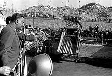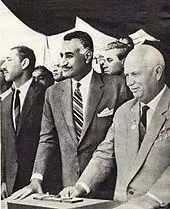 The American Secretary of State John Foster Dulles and the American President Dwight Eisenhower told Nasser that the U.S. would supply him with weapons only if they were used for defensive purposes and accompanied by American military personnel for supervision and training. Nasser did not accept these conditions, but then he looked to the USSR for support. Although Dulles believed that Nasser was only bluffing and that the USSR would not aid Nasser, he was wrong— the USSR promised Nasser a quantity of arms in exchange for a deferred payment of Egyptian grain and cotton. On 27 September 1955, Nasser announced an arms deal, with Czechoslovakia acting as a middleman for the Soviet support.[8] Instead of attacking Nasser for turning to the Soviets, Dulles sought to improve relations with him. This explains the later offer of December 1955, in which the U.S. and Britain pledged $56 and $14 million respectively towards the construction of the dam.[9]