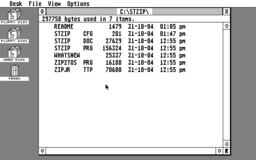 The TOS desktop uses icons to represent files and devices, windows and dialog boxes to display info. The desktop file "DESKTOP.INF" was read to determine window settings, icon placements and drive icons, otherwise the standard default desktop of two floppy icons and the trash icon was used.