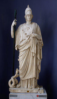 The sculpture was probably a cult image[2] rather than a decorative culture trophy. The serpent at Athena's right foot recalls the archaic myth of Erichthonius in his serpent form. The forearms are restorations, as are the spear and the sphinx upon the goddess's Corinthian helmet.