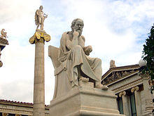 The Greek neo-classical sculptor Leonidas Drosis sculpted the principle multi-figure pediment sculpture, on the theme of the birth of Athena, based on a design by painter Carl Rahl. This brought first prize at the Vienna Exhibition of 1873.[3] Drosis is also responsible for the figures of Athena and Apollo with lyre on the Academy's flanking pillars, and the seated marble figures of Plato and Socrates, which were executed "by the Italian sculptor Piccarelli".[3] The eight smaller pediments in the Academy complex are the terra-cotta work of Austrian sculptor Franz Melnitzky.[4] Interior murals and paintings were done by the Austrian artist Christian Griepenkerl.