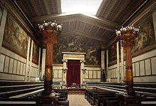 The main building of the Academy is a neoclassical building between Panepistimiou Street and Akadimias Street in the centre of Athens.[2] The building was designed as part of an architectural "trilogy" in 1859 by the Danish architect Theophil Hansen, along with the University and the National Library. Funds had been provided by the magnate Simon Sinas specifically for the purpose, and the foundation stone was laid on 2 August 1859. Construction proceeded rapidly, after 1861 under the supervision of Ernst Ziller, but the internal tumults during the latter years of King Otto's reign, which resulted in his ousting in 1862, hampered construction until it was stopped in 1864. Works resumed in 1868, but the building was not completed until 1885, at a total cost of 2,843,319 gold drachmas, most of it provided by Sinas, and, after his death, by his wife Ifigeneia.
