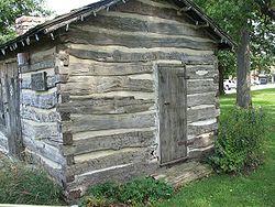 A log cabin stands in Atlantic City Park with a historical plaque bearing the following inscription: