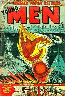 Atlas attempted to revive superheroes in Young Men #24-28 (Dec. 1953 - June 1954) with the Human Torch (art by Syd Shores and Dick Ayers, variously), the Sub-Mariner (drawn and most stories written by Bill Everett) and Captain America (writer Stan Lee, artist John Romita Sr.). The short-lived revival also included restarts of Sub-Mariner Comics (issues #33-42, April 1954 - Oct. 1955)[13] and Captain America (#76-78, May-Sept. 1954).[14] All three superheroes also appeared in the final two issues of Men's Adventures (#27-28, May–July 1954).[15]