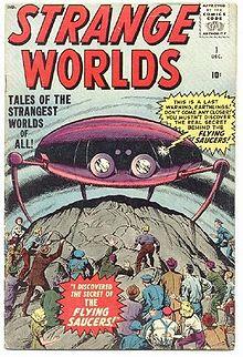 Kirby had previously returned, in late 1956, to freelance on five issues cover-dated December 1956 and February 1957,[49] but did not stay. Now, beginning with the cover and the seven-page story "I Discovered the Secret of the Flying Saucers" for Strange Worlds #1 (Dec. 1958), Kirby returned for a 12-year run that would soon help revolutionize comics. While career necessity led Kirby back to publisher Goodman, whom he had left acrimoniously in 1941, Kirby nonetheless helped elevate simple science fiction and giant-monster stories with what comics historian Charles Hatfield called "a vital jab in the ribs by [his] outlandish artistry.[50]:100 Soon his dynamic work began gracing countless covers and lead stories in the extant Strange Tales and the newly launched Amazing Adventures, Strange Worlds, Tales of Suspense, Tales to Astonish and World of Fantasy. "Offsetting the formulaic nature of the stories was a dash of invigorating absurdity," wrote Hatfield. "The tales had Kirby's energy and, courtesy of Lee, confessional, first-person titles typical of sensation-mongering tabloids and comics, such as, 'I Created Sporr, the Thing That Could Not Die!'"[50]:100–101
