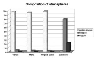 The atmosphere of Venus is composed of 96.5% carbon dioxide, 3.5% nitrogen, and traces of other gases, most notably sulfur dioxide.[14] The amount of nitrogen in the atmosphere is relatively small compared to the amount of carbon dioxide, but because the atmosphere is so much thicker than that on Earth, its total nitrogen content is roughly four times higher than Earth's, even though on Earth nitrogen makes up about 78% of the atmosphere.[1][15]