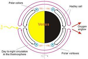 The circulation patterns in the upper mesosphere and thermosphere of Venus are completely different from those in the lower atmosphere.[2] At altitudes 90–150 km the Venusian air moves from the dayside to nightside of the planet, with upwelling over sunlit hemisphere and downwelling over dark hemisphere. The downwelling over the nightside causes adiabatic heating of the air, which forms a warm layer in the nightside mesosphere at the altitudes 90–120 km.[3][2] The temperature of this layer—230 K (−43 °C)—is far higher than the typical temperature found in the nightside thermosphere—100 K (−173 °C).[2] The air circulated from the dayside also carries oxygen atoms, which after recombination form excited molecules of oxygen in the long-lived singlet state (1Δg), which then relax and emit infrared radiation at the wavelength 1.27 μm. This radiation from the altitude range 90–100 km is often observed from the ground and spacecraft.[36] The nightside upper mesosphere and thermosphere of Venus is also the source of non-local thermodynamic equilibrium emissions of CO2 and nitric oxide molecules, which are responsible for the low temperature of the nightside thermosphere.[36]
