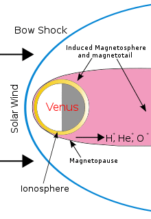 At the subsolar point the bow shock stands 1900 km (0.3 Rv, where Rv is the radius of Venus) above the surface of Venus. This distance was measured in 2007 near the solar activity minimum.[39] Near the solar activity maximum it can be several times further from the planet.[38] The magnetopause is located at the altitude of 300 km.[39] The upper boundary of the ionosphere (ionopause) is near 250 km. Between the magnetopause and ionopause there exists a magnetic barrier—a local enhancement of the magnetic field, which prevents the solar plasma from penetrating deeper into the Venusian atmosphere, at least near solar activity minimum. The magnetic field in the barrier reaches up to 40 nT.[39] The magnetotail continues up to ten radii from the planet. It is the most active part of the Venusian magnetosphere. There are reconnection events and particle acceleration in the tail. The energies of electrons and ions in the magnetotail are around 100 eV and 1000 eV respectively.[41]