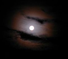 On the right is a 1/10-second exposure showing an overexposed full moon. The Moon is seen through thin vaporous clouds, which glow with a bright disk surrounded by an illuminated red ring. A longer exposure would show more faint colors beyond the outside red ring.