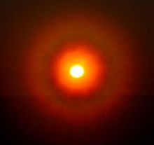 The left photo shows a diffraction ring around the rising Sun caused by a veil of aerosol. This effect dramatically disappeared when the Sun rose high enough until the pattern was no longer visible on the Earth's surface. This phenomenon is sometimes called the corona effect, not to be confused with the solar corona.