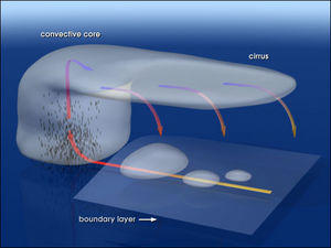 Advanced topics are phase transitions of water, homogeneous and in-homogeneous nucleation, effect of dissolved substances on cloud condensation, role of supersaturation on formation of ice crystals and cloud droplets. Considerations of moist air and cloud theories typically involve various temperatures, such as equivalent potential temperature, wet-bulb and virtual temperatures. Connected areas are energy, momentum, and mass transfer, turbulence interaction between air particles in clouds, convection, dynamics of tropical cyclones, and large scale dynamics of the atmosphere.