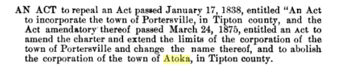 - ^ "Charter for the Town of Atoka Tennessee" (PDF). Chapter 373 House Bill No. 647. State of Tennessee. June 24, 1911. Retrieved July 1, 2013.