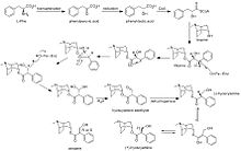 The biosynthesis of atropine starting from l-phenylalanine first undergoes a transamination forming phenylpyruvic acid which is then reduced to phenyl-lactic acid.[34] Coenzyme A then couples phenyl-lactic acid with tropine forming littorine, which then undergoes a radical rearrangement initiated with a P450 enzyme forming hyoscyamine aldehyde.[34] A dehydrogenase then reduces the aldehyde to a primary alcohol making (−)-hyoscyamine, which upon racemization forms atropine.[34]