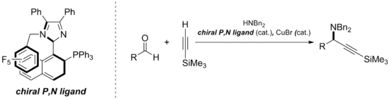 Their ability to provide stereoinduction has led to use in metal catalyzed hydrogenation, epoxidation, addition, and allylic alkylation reactions.[1] Other reactions that can be catalyzed by the use of chiral biaryl compounds are the Grignard reaction, Ullmann reaction, and the Suzuki reaction.[15] A recent example in the area of chiral biaryl asymmetric catalysis employs a five-membered imidazole as part of the atropisomer scaffold. This specific phosphorus, nitrogen-ligand has been shown to perform enantioselective A3-coupling.[16]