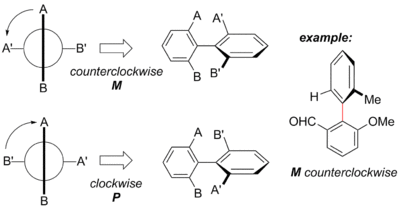 Determining the axial stereochemistry of biaryl atropisomers can be accomplished through the use of a Newman projection along the axis of hindered rotation. The ortho, and in some cases meta substituents are first assigned priority based on Cahn–Ingold–Prelog priority rules. One scheme of nomenclature in based on envisioning the helicity defined by these groups.[8] Starting with the substituent of highest priority in the closest ring and moving along the shortest path to the substituent of highest priority in the other ring, the absolute configuration is assigned P or Δ for clockwise and M or Λ for counterclockwise.[1] Alternately, all four groups can be ranked by Cahn–Ingold–Prelog priority rules, with overall priority given to the groups on the "front" atom of the Newman projection. The two configurations are termed Ra and Sa in analogy to the traditional R/S for a traditional tetrahedral stereocenter.[9]
