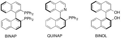 The most important class of atropisomers are biaryls such as diphenic acid, which is a derivative of biphenyl with a complete set of ortho substituents. Heteroaromatic analogues of the biphenyl compounds also exist, where hindered rotation occurs about a carbon-nitrogen or a nitrogen-nitrogen bond.[6] Others are dimers of naphthalene derivatives such as 1,1'-bi-2-naphthol. In a similar way, aliphatic ring systems like cyclohexanes linked through a single bond may display atropisomerism provided that bulky substituents are present. The use of axially chiral biaryl compounds such as BINAP, QUINAP and BINOL, have been found to be useful in the area of asymmetric catalysis as chiral ligands.