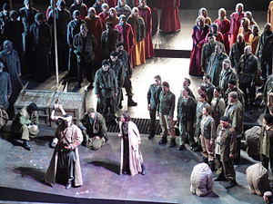 As things turned out, Verdi returned to Piave for the completion of act 3 - with Solera's blessing.[8] However, the relationship between composer and the new librettist worsened in a variety of ways, especially over the use of stage bands in the context of the composer claiming to think in terms of his work being a grand opera: "Aren't Guillaume Tell and Robert le Diable grand operas? Yet they don't contain a band."[9] And the differences between Piave's version and what Solera (who received a copy of Piave's act 3) had originally conceived were so great as to cause a final rift between Verdi and his long-time collaborator; the composer's ideas of musical theatre had moved far ahead of his older colleague.