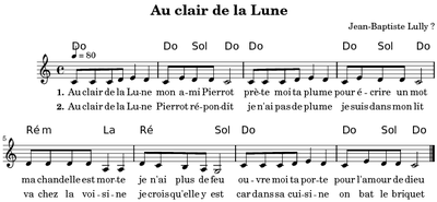 "Au clair de la lune" (French pronunciation: [o klɛʁ də la lyn(ə)],[1] lit. "By the Light of the Moon") is a French folk song of the 18th century. Its composer and lyricist are unknown. Its simple melody is commonly taught to beginners learning an instrument.