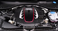 The Audi S6 and S7 are powered by a 4.0L DOHC twin-turbo V8 engine mated to a 7-speed S-tronic Double Clutch Gearbox. This engine makes 420 PS (414 hp; 309 kW) and 406 lb⋅ft (550 N⋅m) of torque, plus there is a cylinder-deactivation system and a stop-start system for improved fuel economy.[9] This was later upgraded to 450 PS (444 hp; 331 kW) for 2016. The 2013 Audi A8 shares the same engine, while the 2012 Audi S8 has a variant of the powerplant in a higher state of tune making 520 PS (513 hp; 382 kW) and 479 lb⋅ft (649 N⋅m) of torque, both mated to an 8-speed automatic transmission.[10] Higher output versions of this 4.0L DOHC twin-turbo V8 engine are found in the 2013 Audi RS6, 2013 Audi RS7, and 2016 Audi S8 Plus.