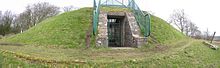 Just outside Augher on the Hill of Knockmany stands the famous cairn of Queen Anya, reputed to be over 2000 years old.[5] There are a number of forests in the vicinity, namely Knockmany and Favour Royal Forest. The former is remarkable for its huge stones with inscribed designs; it is arguably the finest example of Megalithic Art in Ulster.[3] According to Irish Folklore Knockmany is the home of 52 ft giant Fin M'Coul. St Patrick's Chair and Well, another ancient site, set in Altadavin (the foot of the wood), is reputed to have mystical powers.[5]
