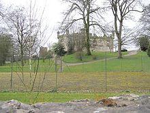 To the west of Augher is Spur Royal Castle, a typical plantation tower house (grid ref: H5654). It was built in 1615 by Lord Ridgeway on the site of an older fortress and was burnt in 1689 by the Jacobites as the Siege of Derry was underway.[3] It was restored and extended in 1832 and a large and handsome mansion built adjoining it by Sir J. M. Richardson Bunbury, Bart. The tower house is about 30 feet (9.1 m) square and three storeys high. The entrance is on the east wall with a machicolation above.[8] It was surrounded by a wall 12 feet (3.7 m) high and flanked by four circular towers; the wall has been removed, but one of the round towers has been restored; and the entrance gateway has also been removed and rebuilt on an elevated situation with extensive views, in which the ruins of the old castle remain. The mansion is situated in a wooded demesne of 220 acres (0.89 km2), and upon the margin of a lake.[9]