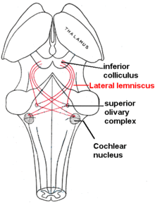 The sound information from the cochlea travels via the auditory nerve to the cochlear nucleus in the brainstem. From there, the signals are projected to the inferior colliculus in the midbrain tectum. The inferior colliculus integrates auditory input with limited input from other parts of the brain and is involved in subconscious reflexes such as the auditory startle response.