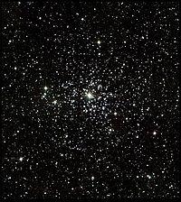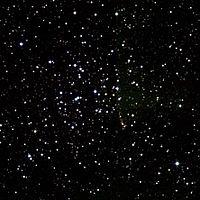 IC 410, a faint nebula, is accompanied by the bright open cluster NGC 1893. The cluster is thin, with a diameter of 12 arcminutes and a population of approximately 20 stars. Its accompanying nebula has very low surface brightness, partially because of its diameter of 40 arcminutes. It appears in an amateur telescope with brighter areas in the north and south; the brighter southern patch shows a pattern of darker and lighter spots in a large instrument.[94] NGC 1893, of magnitude 7.5, is classified as a Trumpler Class II 3 r n or II 2 m n cluster, meaning that it is not very large and is somewhat bright. The cluster possesses approximately 30 stars of magnitude 9–12. In an amateur instrument, IC 410 is only visible with an Oxygen-III filter.[85] NGC 2281 is a small open cluster at a distance of 1,500 light-years. It contains 30 stars in a crescent shape.[16] It has an overall magnitude of 5.4 and a fairly large diameter of 14.0 arcseconds, classified as a Trumpler Class I 3 m cluster. The brightest star in the cluster is magnitude 8; there are approximately 12 stars of magnitude 9–10 and 20 stars of magnitude 11–13.[85]