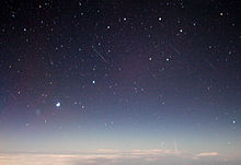 The Aurigids had a spectacular outburst in 1994, when many grazing meteors—those that have a shallow angle of entry and seem to rise from the horizon—were observed in California. The meteors were tinted blue and green, moved slowly, and left trails at least 45° long. Because they had such a shallow angle of entry, some 1994 Aurigids lasted up to 2 seconds. Though there were only a few visual observers for part of the outburst, the 1994 Aurigids peak, which lasted less than two hours, was later confirmed by Finnish amateur radio astronomer Ilkka Yrjölä.[96] The connection with Comet Kiess was finally confirmed in 1994.[97] The 2007 outburst of the Aurigids was predicted by Peter Jenniskens and was observed by astronomers worldwide.[98] Despite some predictions that there would be no Alpha Aurigid outburst, many bright meteors were observed throughout the shower, which peaked on September 1 as predicted. Much like in the 1994 outburst, the 2007 Aurigids were very bright and often colored blue and green. The maximum zenithal hourly rate was 100 meteors per hour, observed at 4:15 am, California time (12:15 UTC) by a team of astronomers flying on NASA planes.[99]
